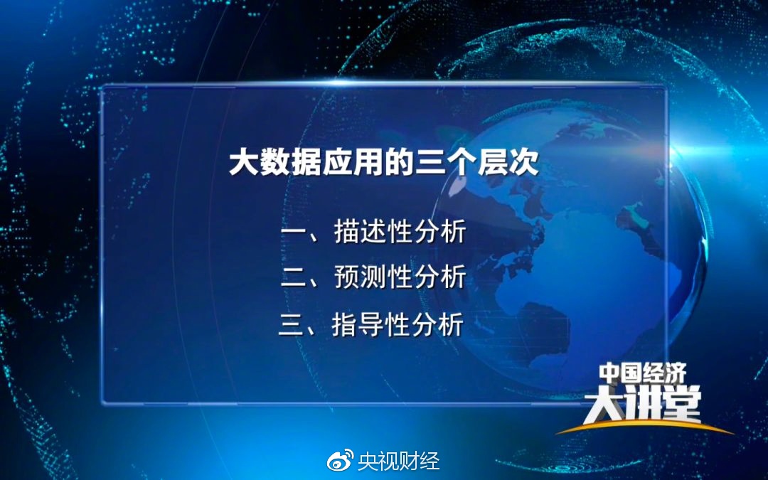 我们现在大数据应用,大体上是分成三个层次。第一个就是描述性分析。指关注现在发生了什么事情,然后把这个事情的事物发展历程,用单纯的数据,给你可视化地展现出来。把当前的数据分析以后,把它的态势给你展现出来,让你能够把握这个事物发展的基本态势,这就是描述性分析。