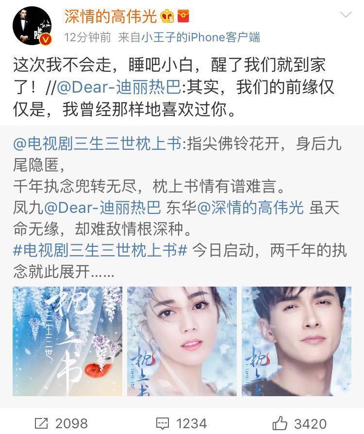 高伟光也深情回应迪丽热巴:这次我不会走!粉丝表示,两人再续前缘,众望所归,这也是迪丽热巴2018年接的第一部剧,出演《枕上书》,要感谢观众对凤九的肯定与厚爱,希望喜欢迪丽热巴的你们可以相信她,相信她可以把每一个角色演好,同时期待演员迪给我们带来精彩。