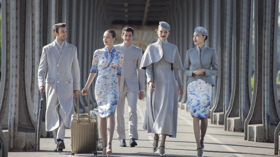女性空服员新制服将中国国服旗袍样式做为基底,採用中国传统元素,宛若青花瓷的靛蓝花纹印花,领口为祥云漫天,下摆为江崖海水,以彩云满天为基,寓意翱翔于云海之间,构成独具海南航空特色的东方之美。