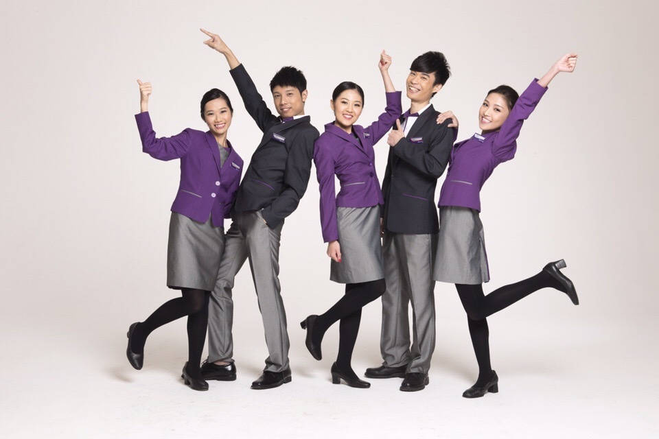 以前快运跟港航的制服几乎是一模一样的,只差在围巾上的图案。不过于2015年起,快运就换上以银色为主调的制服,主个感觉科幻晒!\工作上也算方便,设计不算容易走光!最开心应该是空少们吧,因为不用再穿大紫裤!
