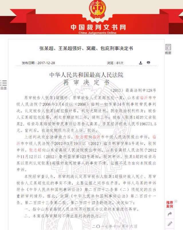 2月2日,中国裁判文书网公布山东张志超一案的再审决定书。其内容显示,最高法院经审查认为,原审判决认定原审被告人张志超强奸致人死亡、原审被告人王广超包庇的事实不清,主要证据之间存在矛盾。最高法院依据刑事诉讼法的有关条款,决定指令山东高院另行组成合议庭对案件进行再审。