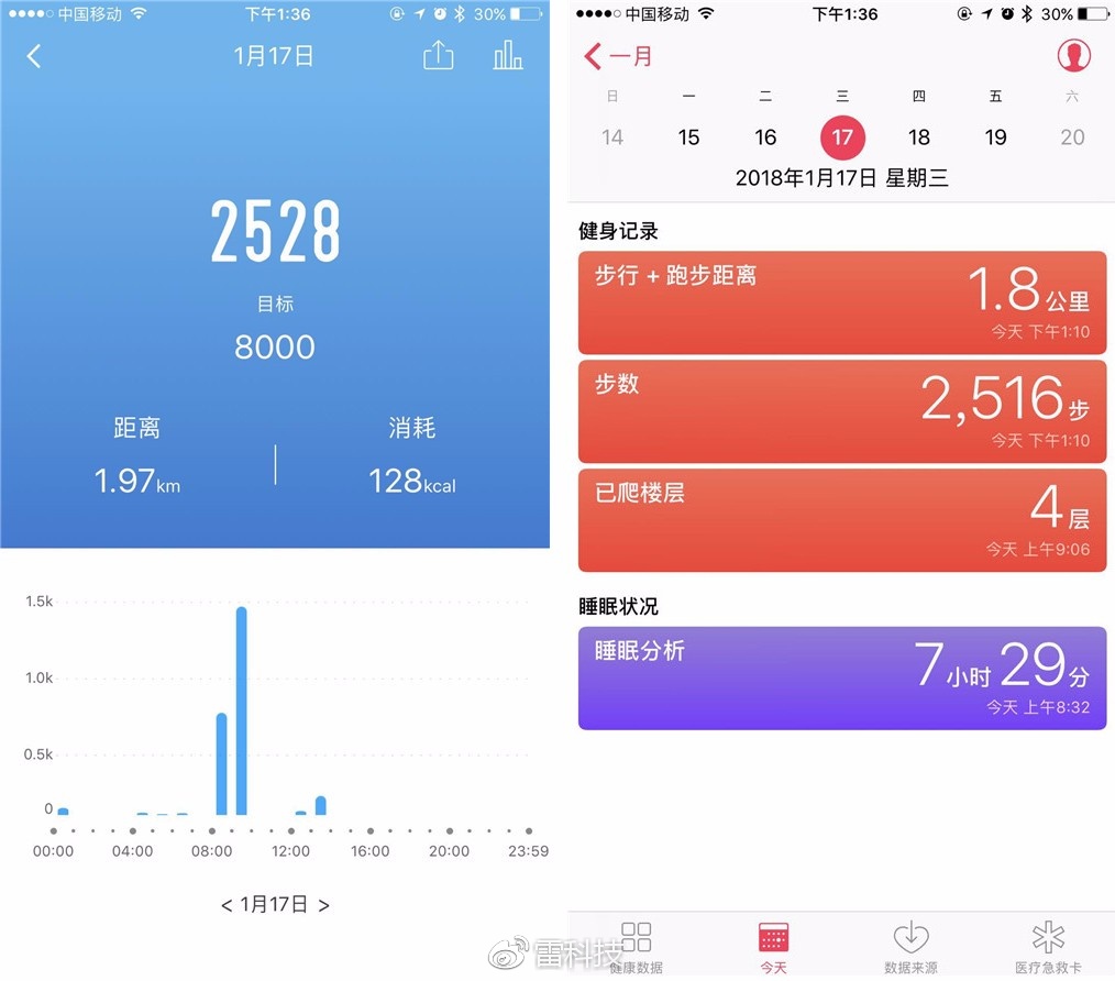 与iPhone7 Plus内置的“健康”APP中记录的一天行走步数和运动距离对比,两者间的数据差别不大。