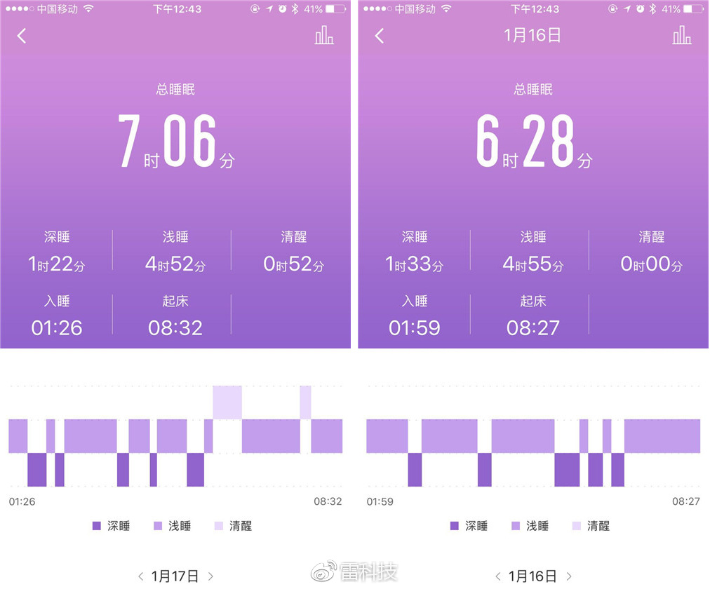 斐讯W1支持睡眠监测,能够记录下用户的睡眠时长、深睡、浅睡、清醒时间、睡眠曲线等信息,在我连续佩戴几个晚上后,斐讯W1在总睡眠时长记录,入睡、起床时间的记录准确性很高,与实际时间相差不大,通过这些数据,我们可以更好地调整作息时间和习惯,提高睡眠质量,看来小雷也不能再熬夜了。