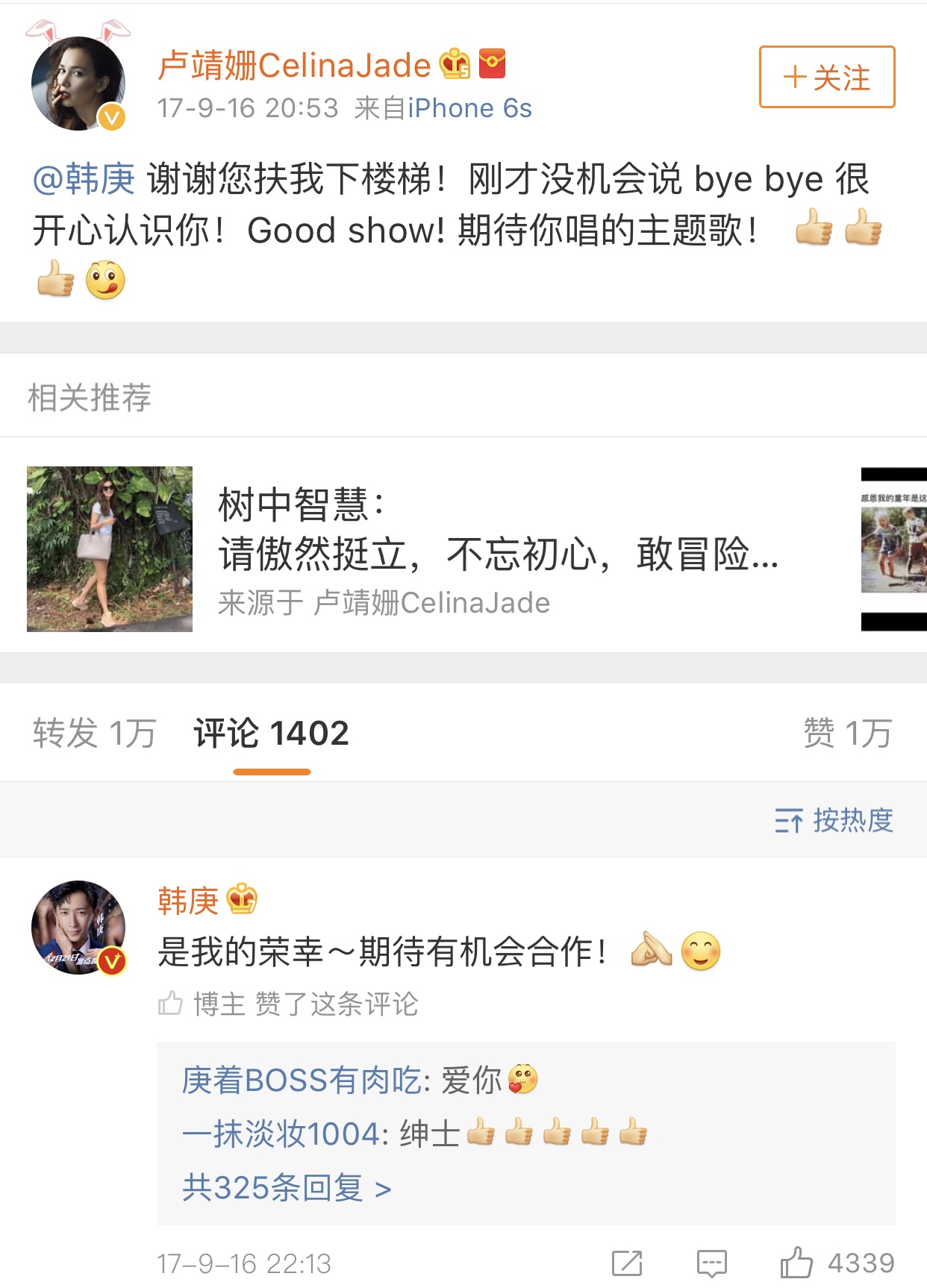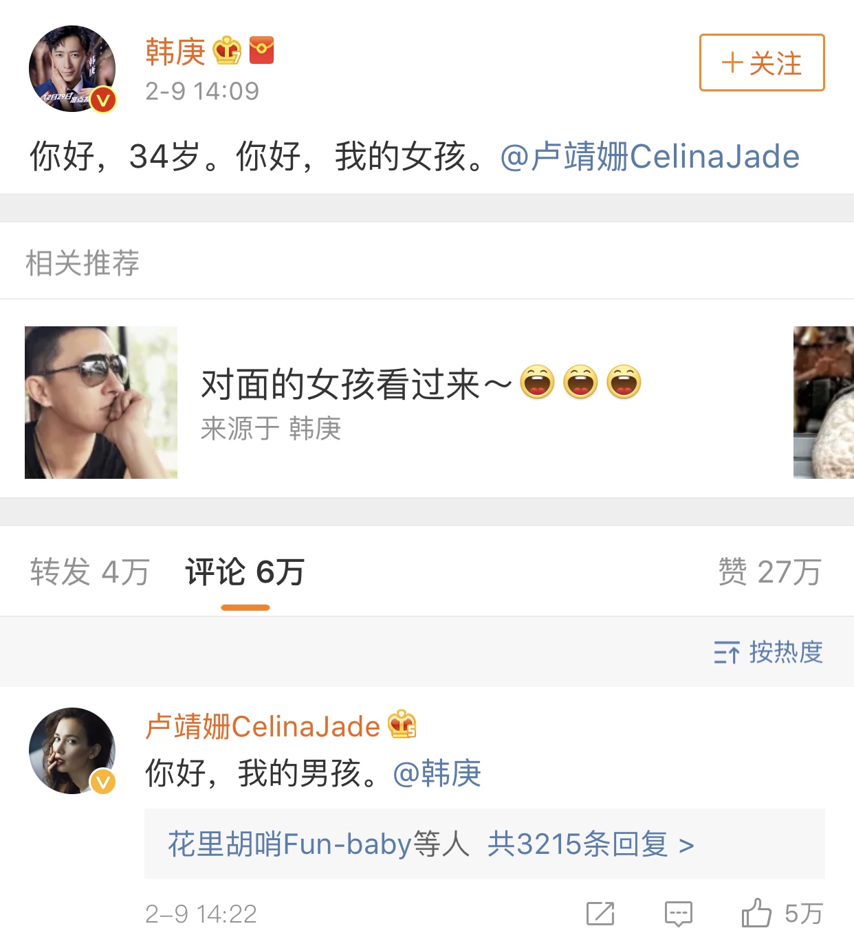 好友郑恺也第一时间转发了韩庚的表白博文,并采用相同句式调侃韩庚“生日快乐,我的孟云”,看来韩庚与卢靖姗的恋情早已获得圈中好友的认可!