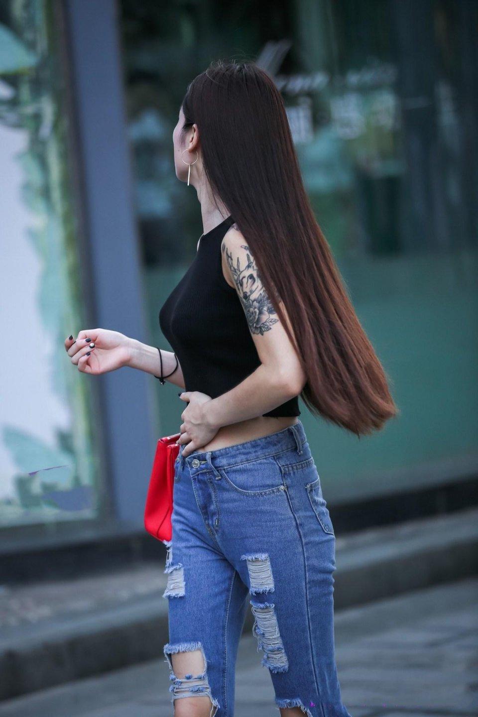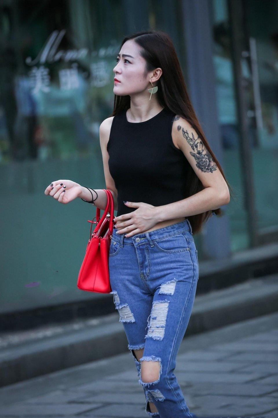 街拍: 露脐装配破洞裤, 少妇的姿势是害羞还是衣服太短着凉了?
