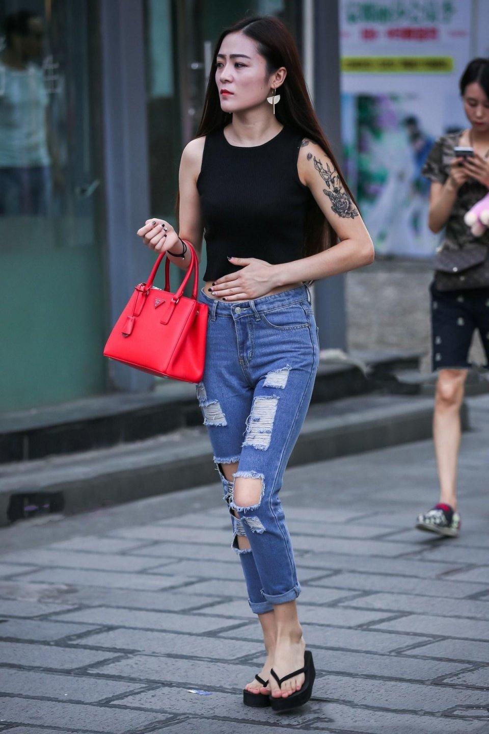 下身搭配一条略显宽松的破洞牛仔裤,新颖吸睛,时尚有个性,脚踩坡跟人字拖,简单大方又不失美感,清凉舒适、随性自然,美丽又养眼。一身简单大方的装扮显露出匀称好身材、也衬托出优美迷人的气质。但是看少妇的手一直捂着,并且眉头紧锁,不知是否是因为衣服过短而着凉了,如果真是如此,那么小编还是建议大家在美丽的同时也别忘了照顾好自己的身体哦!