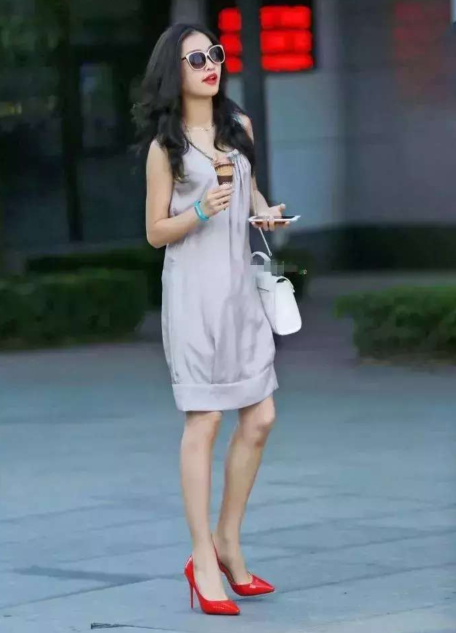 感觉美女的妆容发型还有红色高跟鞋算是一个风格的,很美艳的感觉。这个中分完全的中长发让人也是有一种成熟撩人的气质。高跟鞋就跟不用说了,还是红色的,想必大部分人都能体会出红色高跟鞋的美感吧。