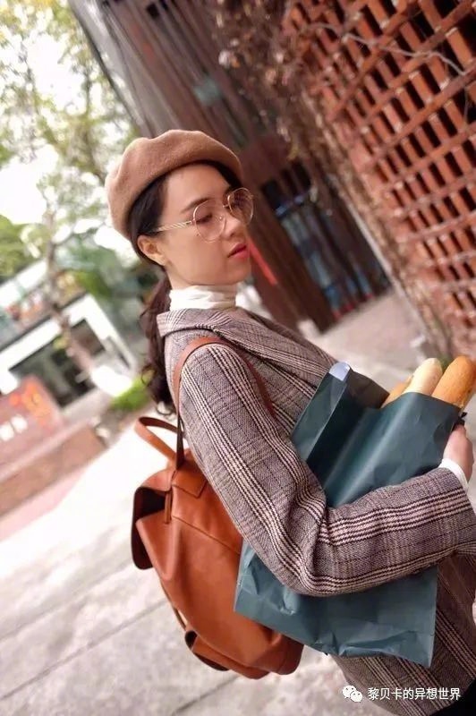 我的穿搭:格纹西装+ 棕色双肩包+贝雷帽+大镜框眼睛+法棍
