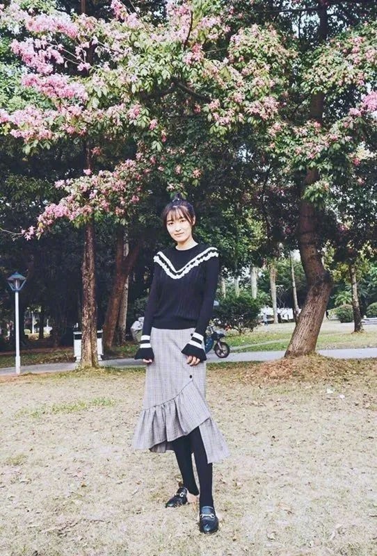 我的穿搭:黑色针织上衣+格纹荷叶边鱼尾裙