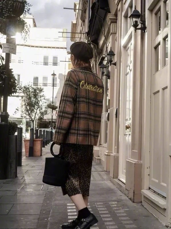 我的穿搭:格纹西装外套+ 麂皮夹克+豹纹半裙+报童帽
