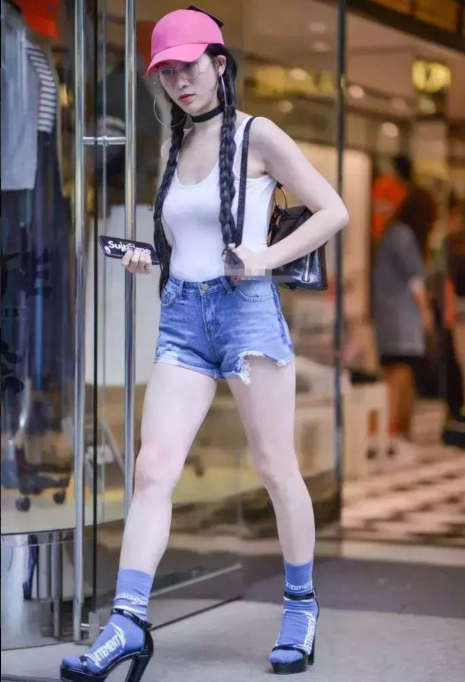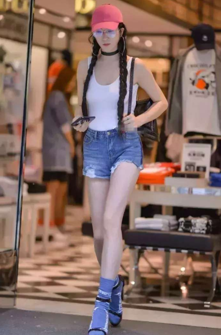 服装上算是比较简单了,上半身白色紧身背心,当然亮点在背后。下面是牛仔热裤,是挺常见的单品。脚上比较奇特,一双蓝色的高筒袜,外面是黑色高跟凉鞋,颜色和牛仔裤也呼应了,不会太杂乱,不过这种感觉真的不是特别常见啊。