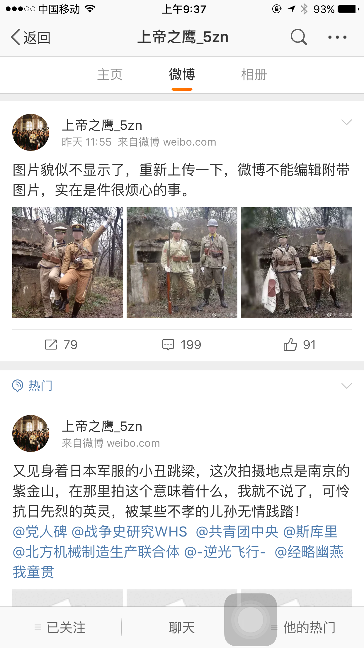 图:网友@上帝之鹰_5zn爆料两青年身着日军军服在抗战碉堡前拍照