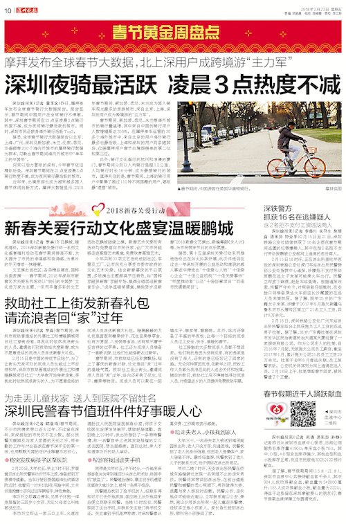 昨日,摩拜单车发布全球春节骑行大数据报告。报告显示,春节期间中国用户在全球骑行不停歇。其中,深圳春节期间在 21 点至凌晨 3 点骑行热度不减,成为夜间骑行最活跃的城市。同时,深圳市民还跻身海外骑行活跃 Top3。