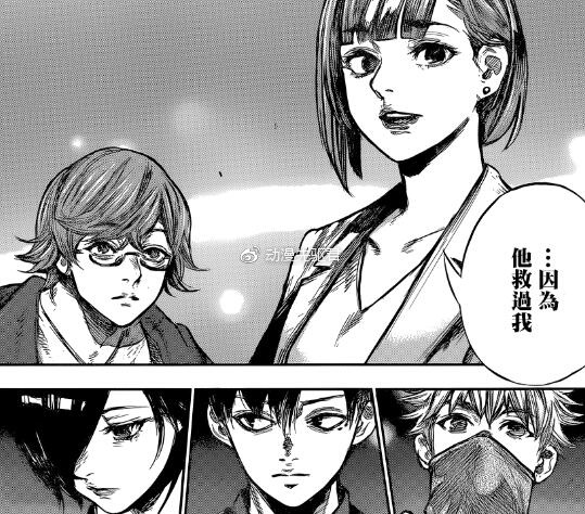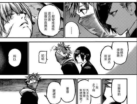 回归162话的剧情,金木研被抬回来,暂时处在昏迷状态,或者说只有纯粹的生命特征而已,大家都在担心金木没法苏醒过来,俗话说得好,愿意守护他人之人必得庇佑,也被守护人所守护,一大波曾被金木研所拯救的人围在身边的那种幸福感,相信在座的各位都能深深感受到吧,特别是卡卡英和董香的对话,也是十分有趣的,卡卡英对董香说了谢谢,这三个的关系真心复杂,也超级温馨,金木有了个好老婆,更有一个愿意为他牺牲的好基友,人生应当悲极而喜。
