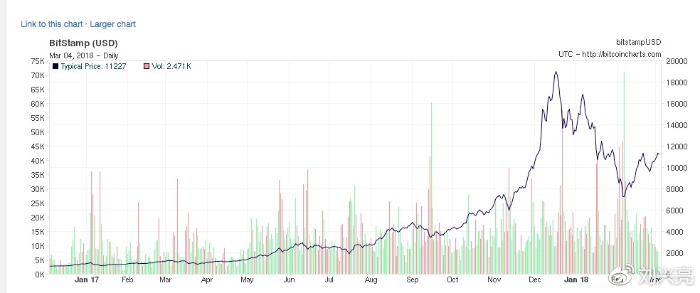过去一年,比特币的走势大家都知道了。从16年底1000美元左右直接拉高到20000美元并触顶开始快速下跌到7000美元,最近又慢慢涨回到11000美元左右。