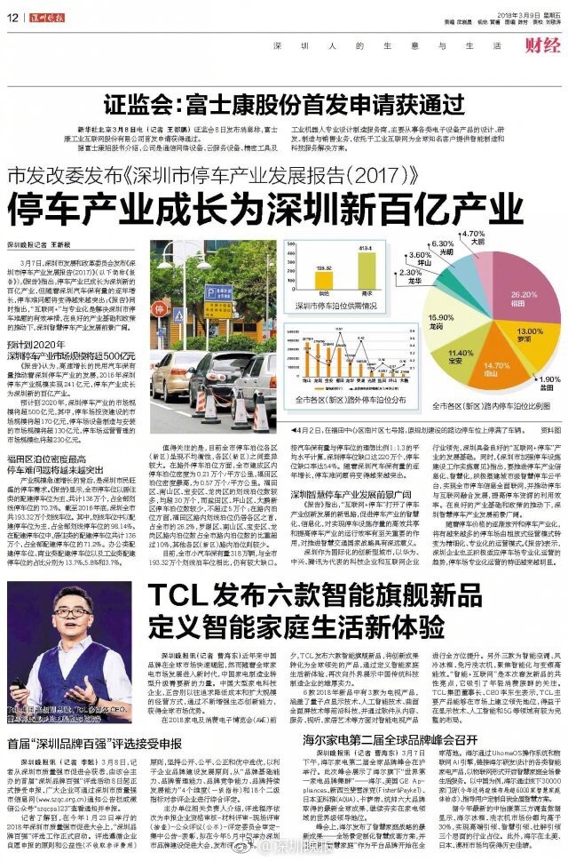 3 月 7 日,深圳市发展和改革委员会发布《深圳市停车产业发展报告(2017)》(以下简称《报告》),《报告》指出,停车产业已成长为深圳新的百亿产业,但随着深圳汽车保有量的逐年增长,停车难问题将变得越来越突出;《报告》同时指出," 互联网 +" 与专业化是解决深圳市停车难题的有效举措,在良好的产业基础和政策的推动下,深圳智慧停车产业发展前景广阔。