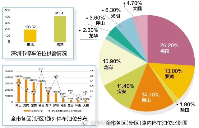 值得关注的是,目前全市停车泊位各区(新区)呈现不均衡性,各区(新区)之间差异较大。在路外停车泊位方面,全市建成区内停车泊位密度为 0.21 万个 / 平方公里,福田区泊位密度最高,为 0.57 万个 / 平方公里。福田区、南山区、宝安区、龙岗区的划线泊位数较多,均超 30 万个,而盐田区、坪山区、大鹏新区停车泊位数较少,不超过 5 万个;在路内泊位方面,福田区路内划线泊位仍居各区之首,占全市的 26.2%,罗湖区、南山区、宝安区、龙岗区路内泊位数占全市路内泊位数的比重超过 10%,其他各区(新区)路内泊位则较少。