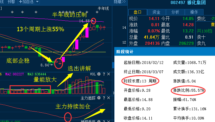 雅化集团002497这只票是在2月9号选出讲解的,股价前面上涨后,进入持续下跌的走势在跌至8.8元附近止跌反弹,收出十字星的企稳信号。在市场利好消息下,主力开始进场加仓迹象明显,资金流入MACD处于多头趋势,在风险被释放后本人及时选出讲解,底部机会凸显,从讲解后6个周期上涨27.58%。不少当时看到选股文章的朋友都抓到了这一波的盈利空间! 再次的恭喜那些之前看过本人的选股文章的新手股民朋友抓到了这一波收益。这只股在第一天涨停的时候是最佳的一个涨停板。从战法上来说,上周五形成了一个典型的V形反包走势。