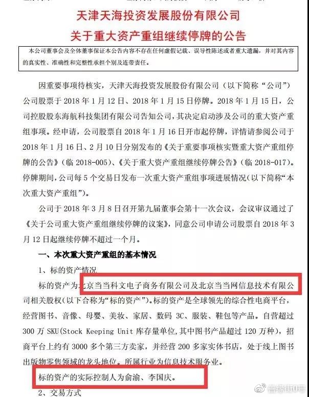天海投资3月9日披露重组信息,收购标的资产为北京当当科文电子商务有限公司及北京当当网信息技术有限公司相关股权。目前,具体方案仍在沟通协商中,称交易完成后其控制权不会发生变更。