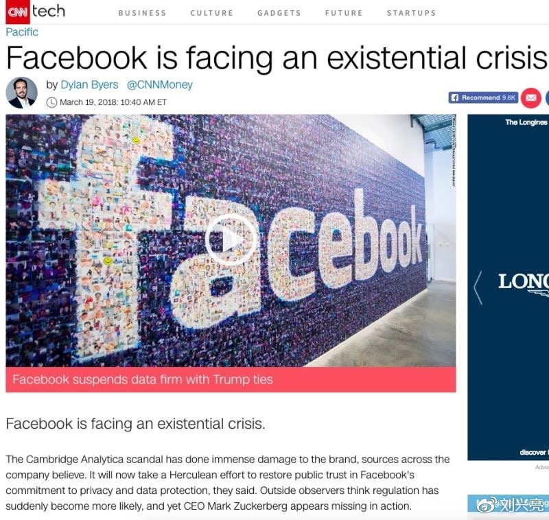 CNN的报道,标题是Facebook is facing an existential crisis,翻译过来就是:Facebook正面临一场生存危机。这个生存危机的意思,说的应该不是能不能吃饱饭的那种生存, 而是「活下去有什么人生意义」的生存危机,就是说Facebook面对的危机是信任危机。