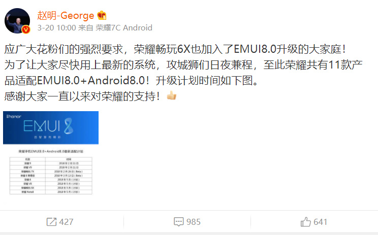 近日,荣耀总裁赵明在微博上宣布,老款机型荣耀畅玩6X将会获得EMUI 8.0+安卓8.0的系统更新,一则看似平淡无奇的新闻,却引来了荣耀粉丝在微博的点赞,让人意外。