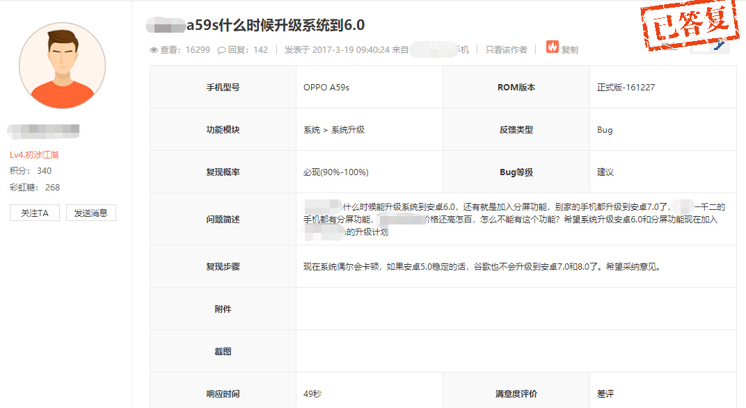 有用户在论坛留言发问什么时候能获得升级,当得知管理员的否定回复后,愤怒地留下“不会再买!”的发言,可见该手机厂商这样的做法伤透了用户的心。
