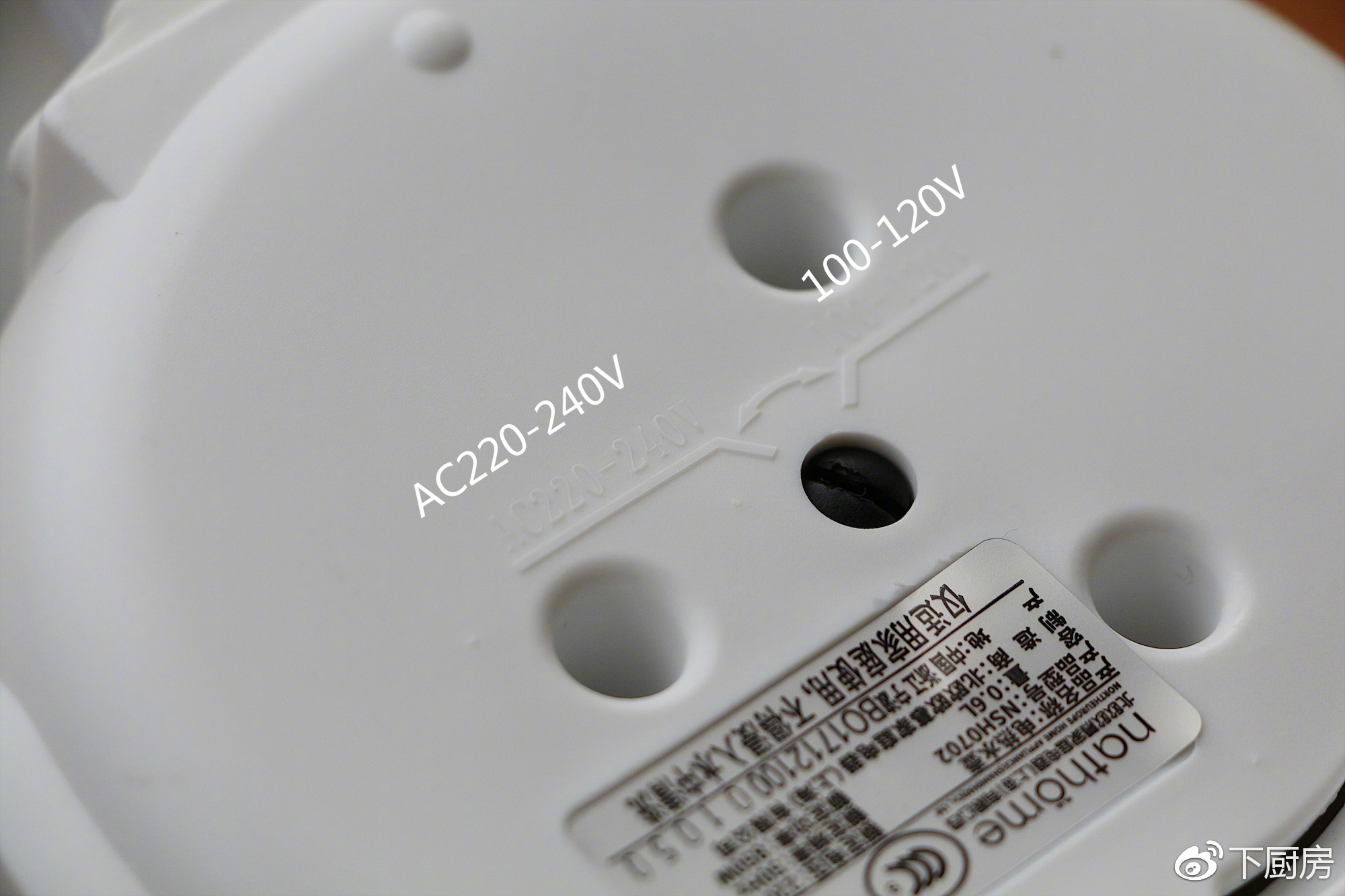 当翻转水壶,又能发现一个贴心的地方:双电压设计。很多地区的电压与我们(220V)不同,如台湾日本美国为110V,如果出国还得带着一个变压器就很累心了,所以这个双电压真是设计到我心窝了。转动黑色的旋钮,就可以自动切换电压了。