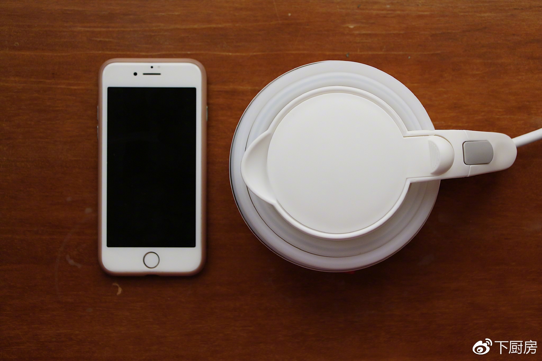 电水壶折叠前,壶身直径14cm,高17.2cm,折叠后,就变成小矮子了,高度只有9.7cm。这个大小别说放在行李箱了,双肩包都可以,不占空间。