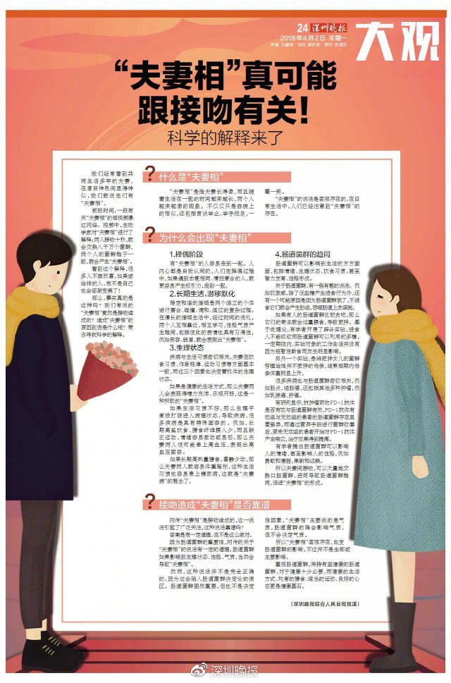 因为肠道菌群的重要性,网传的关于 " 夫妻相 " 的说法有一定的道理,肠道菌群如果影响到生理状态、性格、气质,当然会导致 " 夫妻相 "。