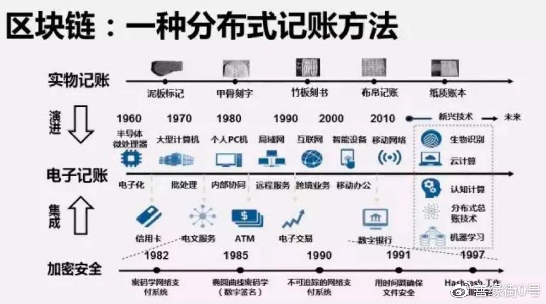 最早是通过泥板标记,到甲骨刻字,再发展到纸质账本,以及到六十年代记账的模式的电子化。一直发展到最近十年(比特币在2009年出现)我们在研究区块链。其实这就是人类记账方式的一个自然的演变的过程。