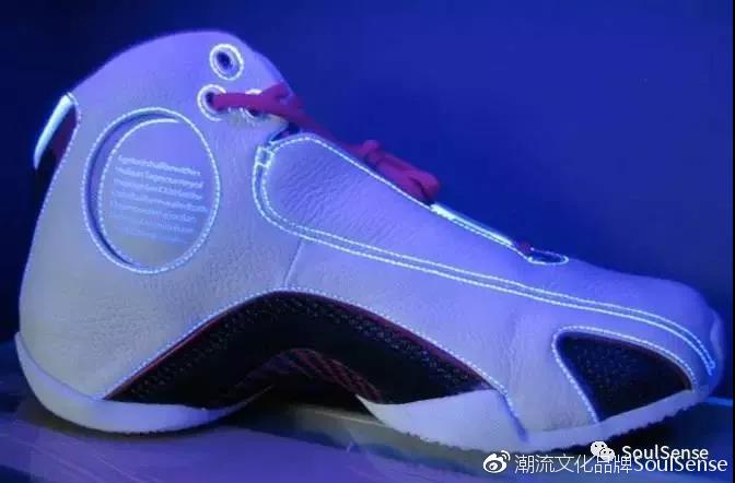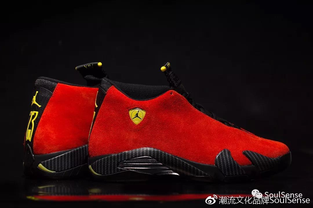解密:第14双 Air Jordan 系列成员在外型上有很明显的汽车印记(它的设计灵感来自于迈克尔·乔丹的爱车 Ferrari 550 Maranello)。被隐藏起来的细节是两双鞋上的 Jumpman Logo 每只上各有7个,一双鞋14个 Jumpman Logo 代表了这一系列已经走到了第14个年头。你可以在这双鞋的脚踝处、鞋头处、外底上、鞋垫上、鞋跟上以及鞋带两头找到它们。