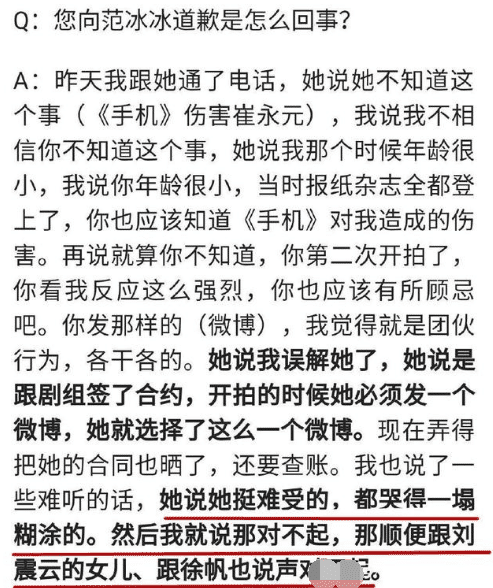 昨日崔永元接受了某媒体的采访,透露范冰冰终于致电向崔永元致歉。两人在谈话中范冰冰情绪激动崩溃大哭,表示崔永元误解她了,此举给她带来了很大的伤害。面对范冰冰的泪水,崔永元心软对其道歉,可是道歉已经太晚,范冰冰求放过也不能阻止事态的发展,事情已经不是崔永元能控制得了的了,现在税务局已经介入调查,并表示爆料者应积极配合调查,交出有关证据。