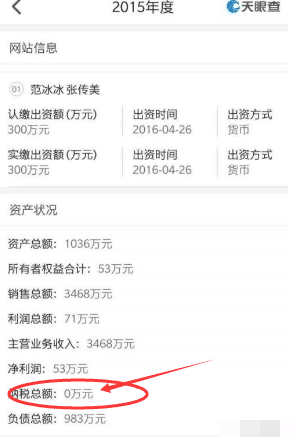 1.“范冰冰无锡公司纳税数据:天眼查年报显示2015年收入3500万纳税0元”。