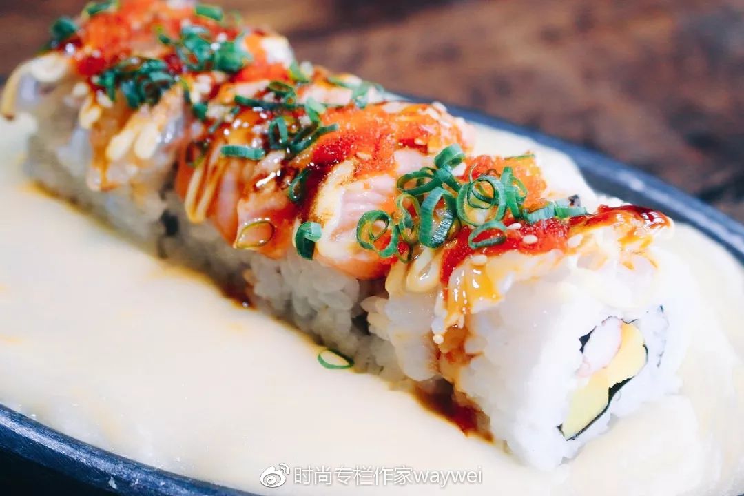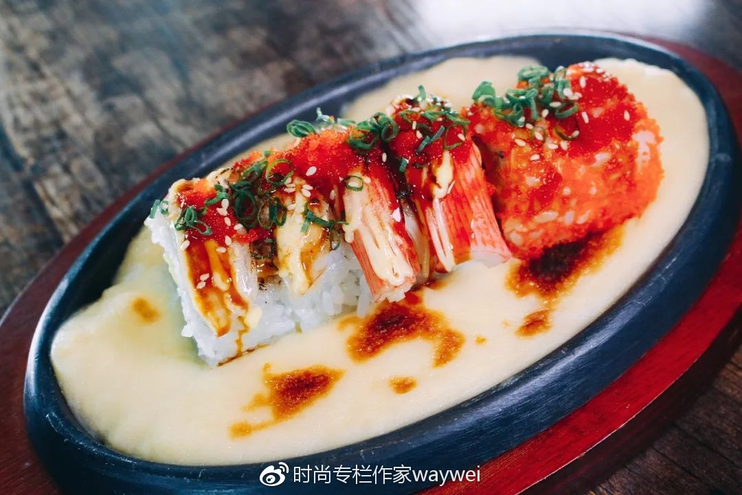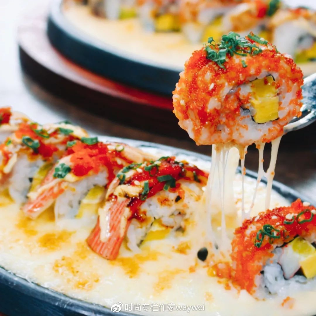 蟹子加上三文鱼,绵软鲜甜的三文鱼和蟹子在一起,以一层厚厚的芝士做底,这份寿司也是绝了!