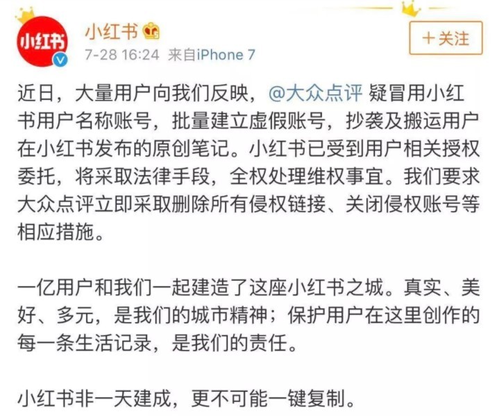 在这场交锋中,小红书是义正言辞地指责大众点评通过批量建立虚假账号,抄袭及搬运用户在小红书发布的原创笔记。而且据小红书估计,抄袭的数量在百万条量级。也就是说,站在小红书的角度看,大众点评的抄袭显然是“有预谋”的。