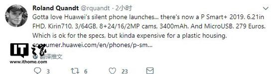 另据国外推特用户@rquandt的消息,华为畅享9S的海外版本华为P Smart+ 2019此前已经上线华为官网。根据华为官网的信息,华为畅享9S采用了一块6.21英寸的全高清屏幕,处理器则采用麒麟710。存储搭配为3GB+64GB。