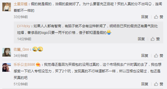 也有网友表示,在广州,奢侈品高仿货市场并不鲜见,已经存在很多年的时间。把奢侈皮你当做炫富攀比的工具、社会地位的衡量标准,或许也是助长奢侈品高仿、造假之风的始作俑者之一。