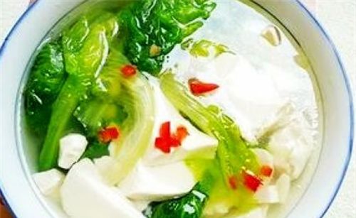 生菜豆腐汤:生菜与营养丰富的豆腐搭配食用,则是一种高蛋白、低脂肪、低胆固醇、多维生素的菜肴,具有清肝利胆,滋阴补肾,增白皮肤、减肥健美的作用。对目赤肿痛、肺热咳嗽、消渴、脾虚腹胀等也有一定的食疗作用。这道汤真是太好了。