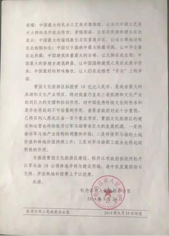 牡丹江2014年为曹园拟建项目向央企中国农业发展集团发出的公函