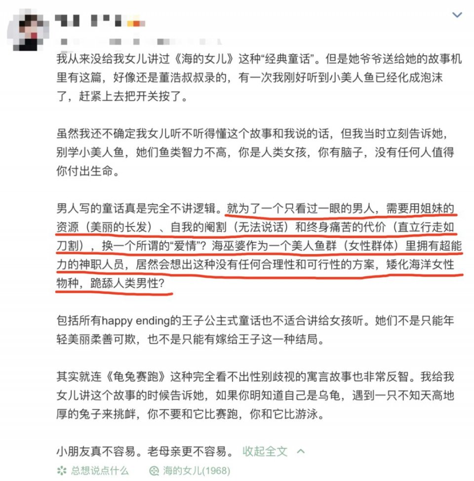 太不像话了,前段时间,微博上就有上一位母亲吐槽安徒生《海的女儿》:“为了一个只看过一眼的男人,需要用姐妹的资源(美丽的长发)、自我的阉割(无法说话)和终身痛苦的代价(直立行走如刀割),换一个所谓的爱情?”