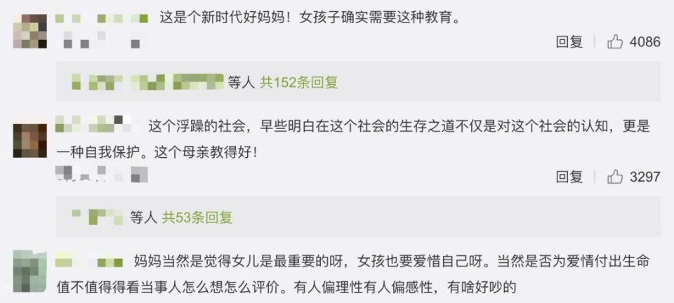 也有网友站在妈妈这边,认为女孩应该早点懂得爱惜、保护自己。