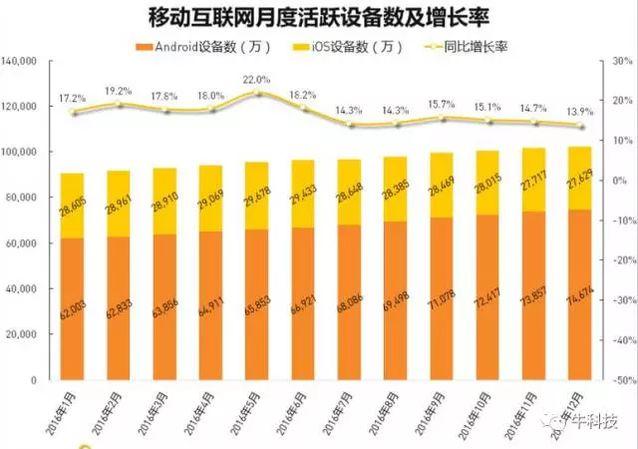 1月12日,国内知名的移动大数据服务商Quest Mobile发布了最新的年度报告——“2016年度APP价值榜”,报告显示,目前中国移动互联网月度活跃用户(设备)数量已经突破了10亿大关,不过同比增长率持续震荡下滑。