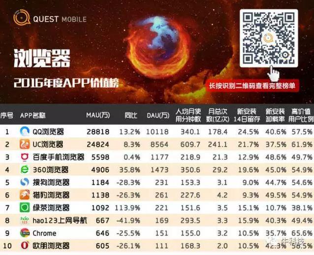 实际上,移动浏览器领域的选择也不多,如QQ浏览器、UC浏览器等等。据Quest Mobile数据,在2016年度APP价值榜中,QQ浏览器排名第一,无论是MAU、DAU、人均月使用分钟数等均名列前茅。更重要的是,QQ浏览器仍在保持高速增长。