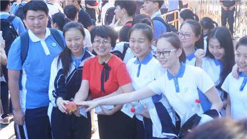 同样是在福田中学,记者注意到一位送考老师专门带来一个大苹果,站在门口迎接自班考生。每一位考生经过几乎都会和这位老师握手、拥抱,并抚摸苹果。这位老师向记者表示,苹果寓意平平安安,考的全会,蒙的全对。