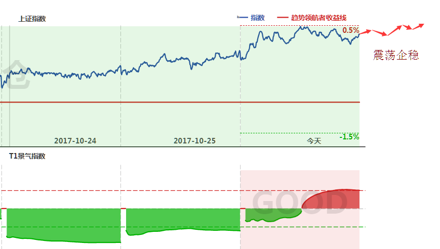 上证指数方面,周四上证T1指标开在零轴和绿色虚线之间,显示早盘开盘后投资者仍然不看好大盘股的表现。随时时间的推移,上证景气不断回升并翻红,尾盘T1指标上穿红色买入虚线但未触及建仓条件。截止收盘,上证T1指标收在红色买入虚线上方,投资者对大盘股的预期相对看多。依此判断,我们认为周五上证指数将会出现震荡企稳的走势。