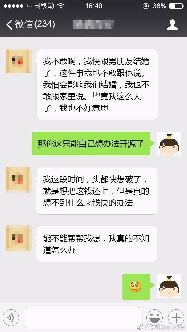 文中的妹纸,口袋君依然建议你向父母和男友坦白。父母是这个世界上,最爱你的人,他们会不带任何坏心的帮助你。向爱人坦白,由爱人做出抉择,既是信任,也是情义。如果他还将和你走下去,这笔债务将是要和你共同分担的。你有责任,也有义务告诉他,不要用侥幸心理去欺骗一个真心待你的人。