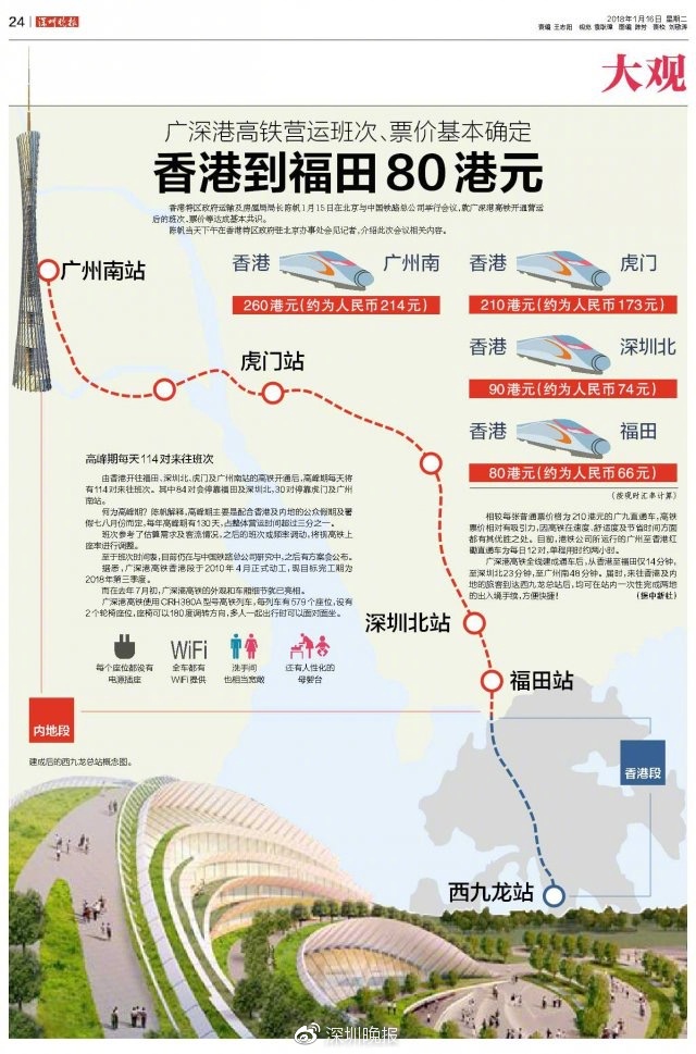 喜大普奔!广深港高铁票价基本确定:香港到福田 80 港元,香港到深圳北 90 港元,香港到虎门 210 港元,香港到广州南 260 港元。