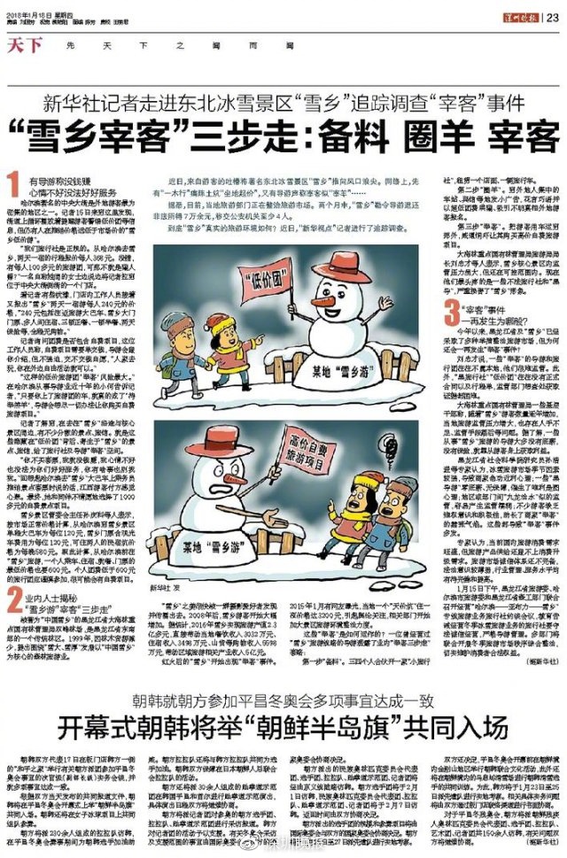 近日,来自游客的吐槽将著名东北冰雪景区 " 雪乡 " 推向风口浪尖。网络上,先有 " 一木行 " 痛陈土炕 " 坐地起价 ",又有导游声称宰客似 " 宰羊 "……