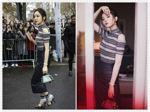 娜扎时装周的无修图, 条纹T恤搭配皮裙, 网友: 美上天!