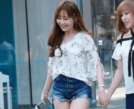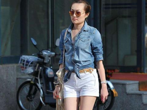 街拍: 美女身穿白色短裤配牛仔衬衫, 时尚清纯显露完美身材!